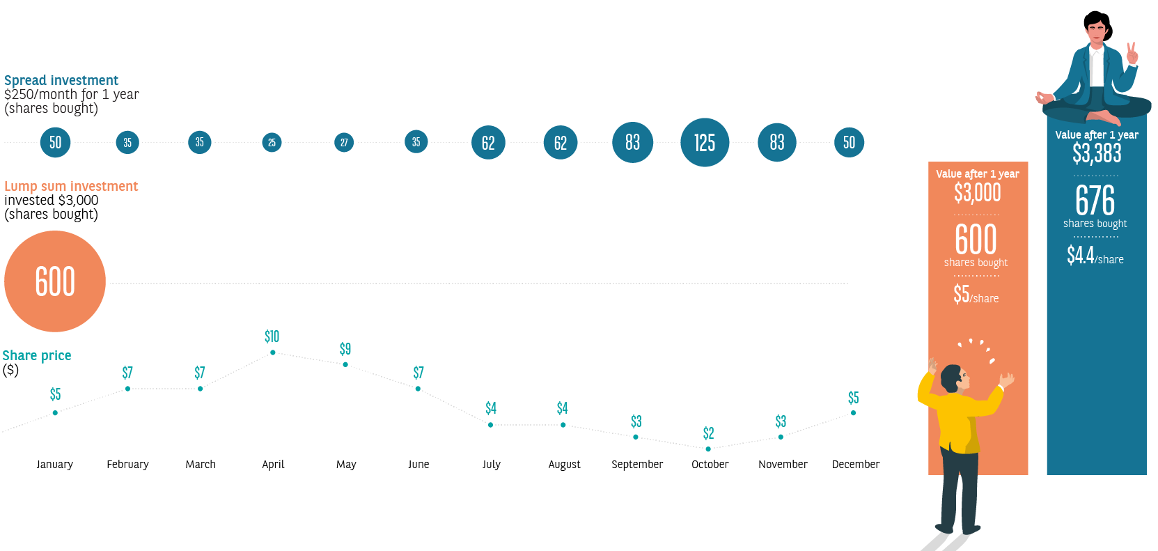 Cost averaging (CA) is an investment strategy with the goal of reducing the impact of volatility on large investments. By dividing the total amount you are looking to invest into equal amounts, and investing at regular intervals, CA aims to reduce the risk of incurring a substantial loss resulting from investing the entire ‘lump sum’ just before a fall in the market.
