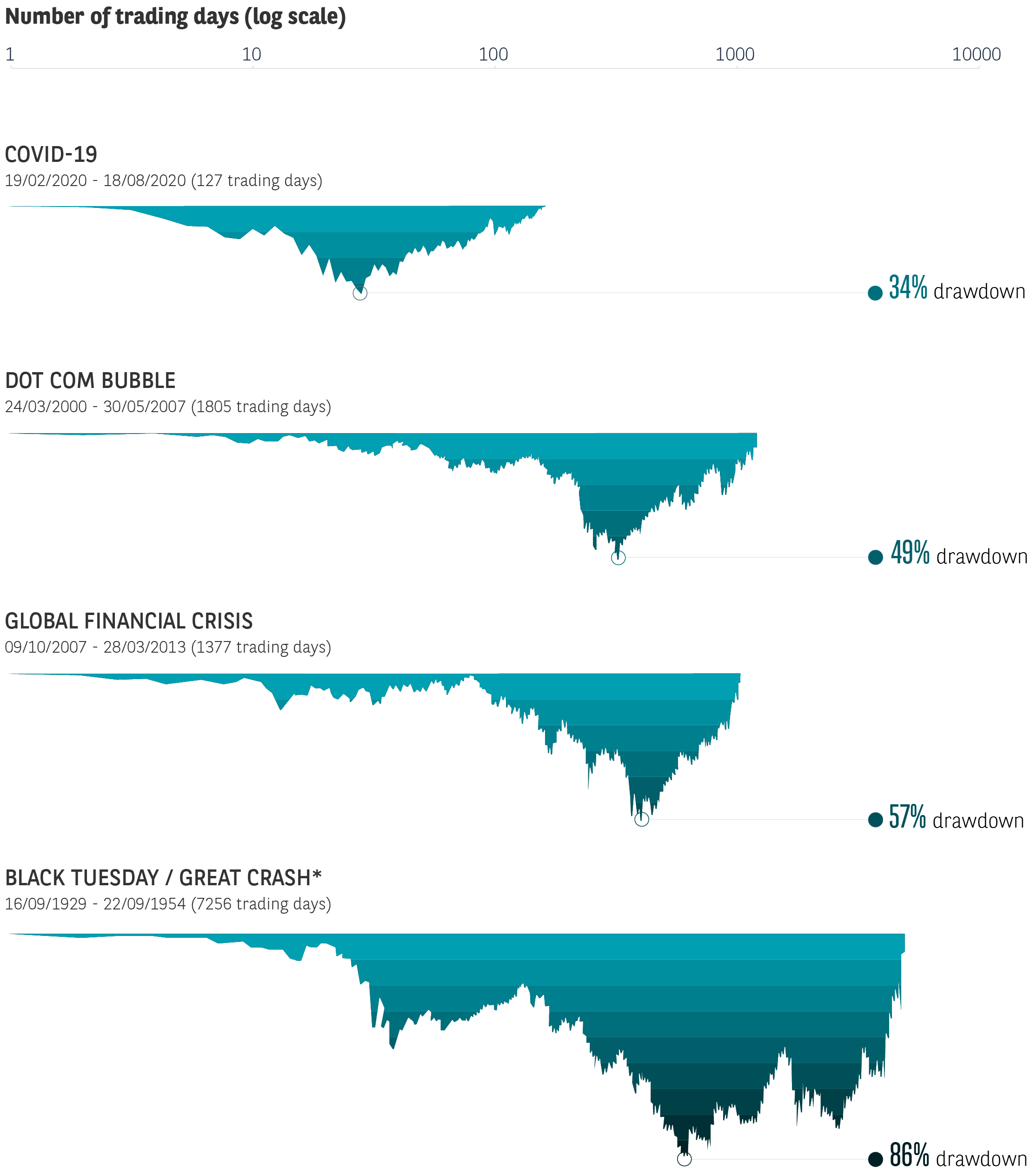 Bloomberg, as at 31 July 2023. *Black Tuesday occurred about a month after the market peak on Oct 29, 1929. Maximum drawdown: the peak-to-trough decline of an investment over a specific time period. Quoted as a percentage of the peak value.
