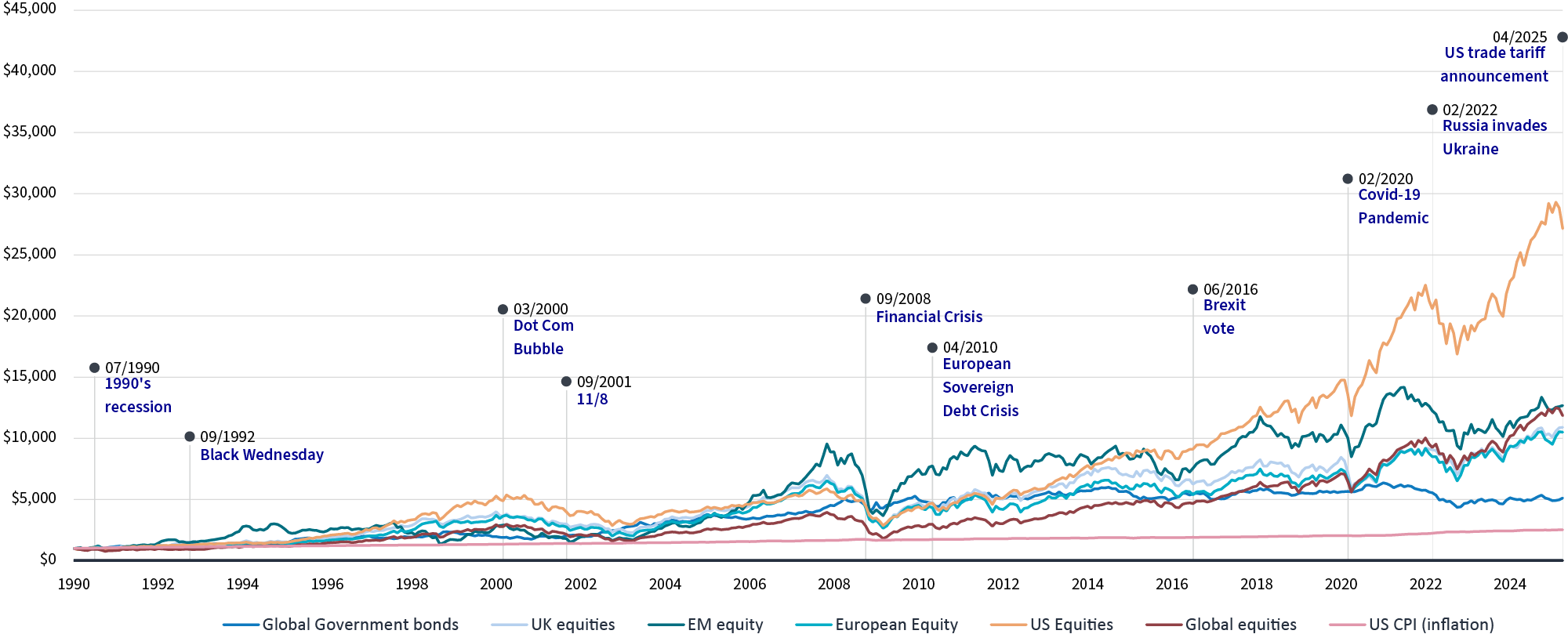 Source : Morningstar, data 31 December 1989 to 30 June 2025. US dollars. Rebased to 1000. Past performance does not predict future returns.