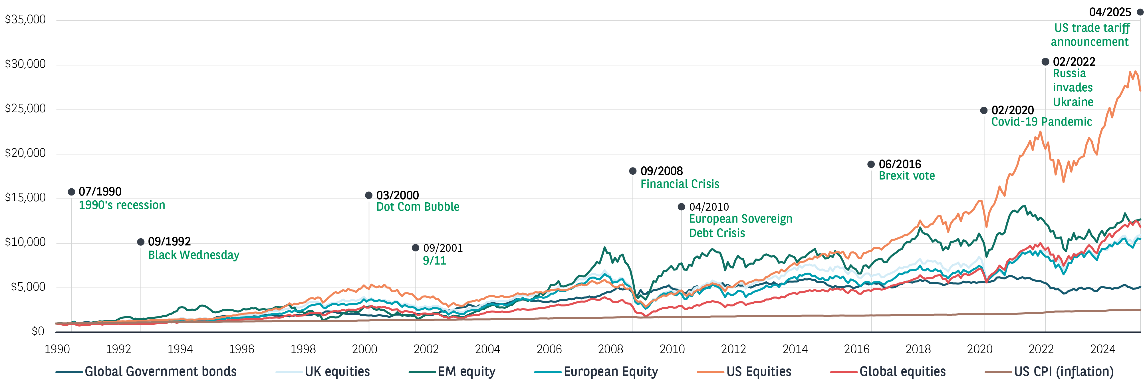 Source : Morningstar, data 31 December 1989 to 31 March 2025. US dollars. Rebased to 1000. Past performance does not predict future returns.